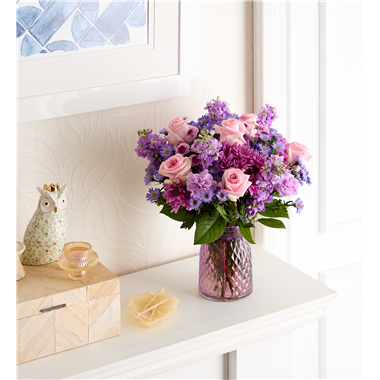 EXCLUSIVE Just like a daydream. Our delightful lavender bouquet is gathered with accents of pink and lush greenery in an embossed lavender vase that complements the delicate beauty of the blooms.